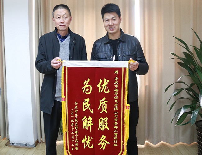 12月16日上午,市開發(fā)區(qū)野妹中式快餐負(fù)責(zé)人來到安慶港華,將一面繡有“優(yōu)質(zhì)服務(wù) 為民解憂”的錦旗,贈與公司工商運(yùn)行組表示感謝。