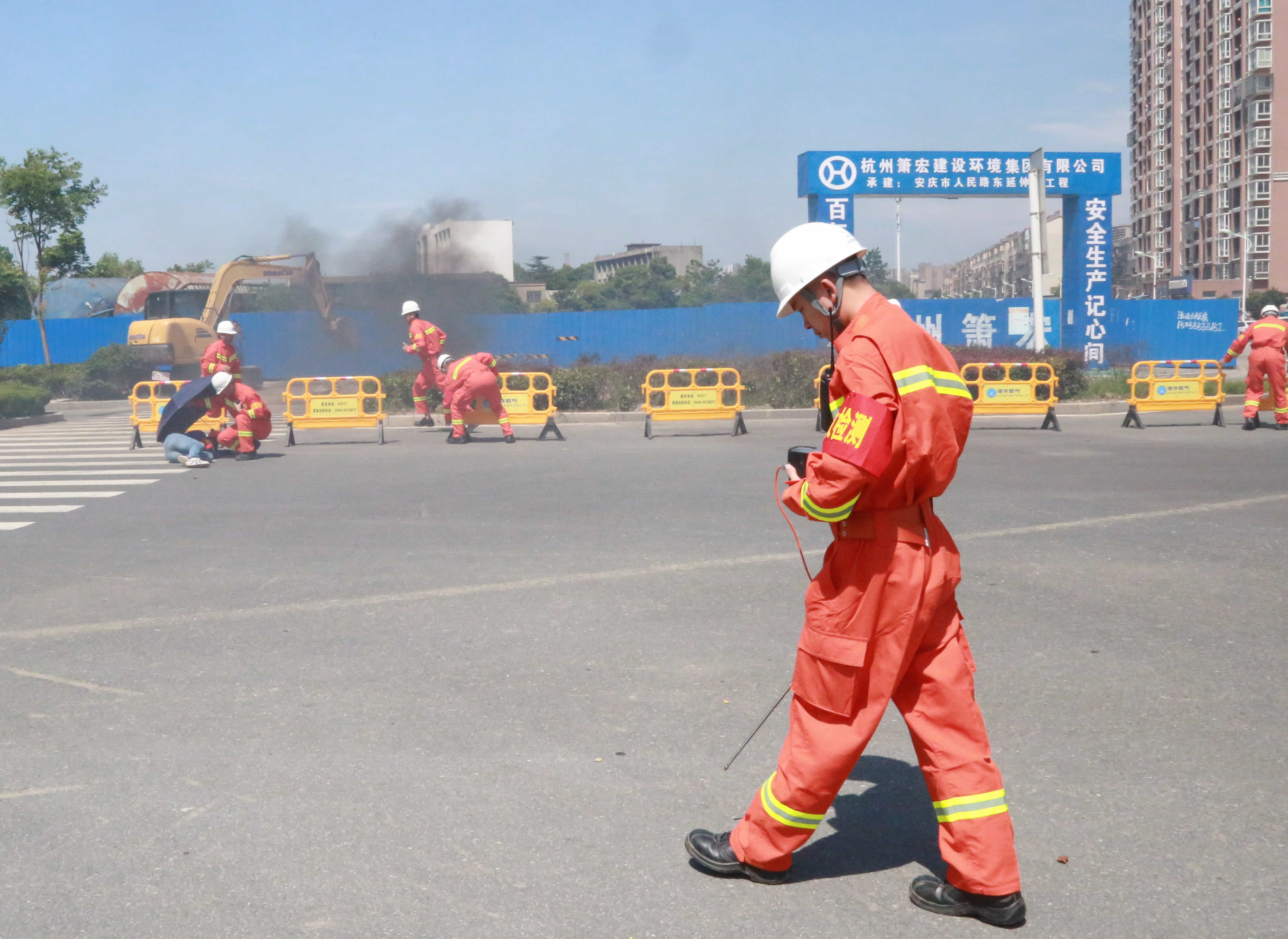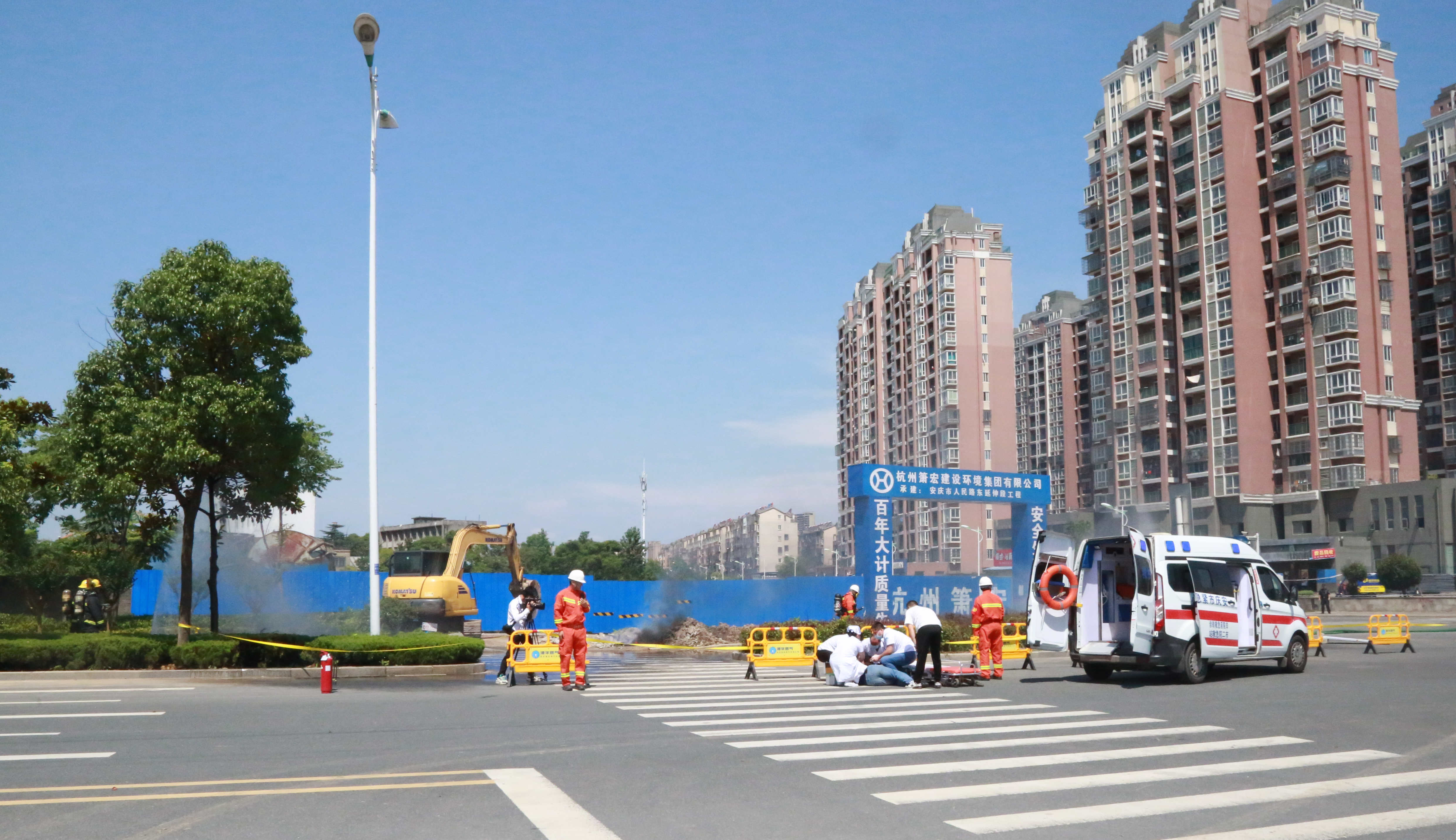 本次演練現(xiàn)場(chǎng)模擬了因第三方施工單位違章作業(yè)挖破安慶市迎江區(qū)獨(dú)秀大道水岸花都小區(qū)南側(cè)(獨(dú)秀大道與華中東路交叉口南行約200米)的地下中壓天然氣管道,引發(fā)天然氣泄漏后遇火源發(fā)生爆燃,造成多名人員受傷,同時(shí)泄漏的燃?xì)膺€竄至附近水岸花都小區(qū)市政管網(wǎng),隨時(shí)可能引發(fā)爆炸事故,威脅小區(qū)約3000戶居民及商戶生命財(cái)產(chǎn)安全。接到報(bào)警電話后,安慶港華燃?xì)馀c市公安局、市消防救援支隊(duì)、市衛(wèi)健委、迎江區(qū)政府、龍獅橋鄉(xiāng)政府等單位及時(shí)組織力量趕赴現(xiàn)場(chǎng),并按照《安慶市城市燃?xì)馐鹿蕬?yīng)急預(yù)案》要求協(xié)同配合,有序開展現(xiàn)場(chǎng)警戒、群眾疏散、傷員救治、消防救援、搶險(xiǎn)搶修等應(yīng)急處置工作。