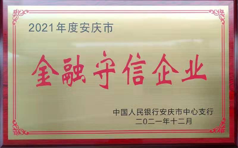 “金融守信企業(yè)”稱號(hào)系根據(jù)《安慶市金融守信企業(yè)評(píng)定實(shí)施辦法》,經(jīng)市中級(jí)人民法院、市住建委、稅務(wù)局、工商質(zhì)監(jiān)局、環(huán)保局、公管局等部門評(píng)議,并由安慶市銀行行長(zhǎng)聯(lián)席會(huì)議評(píng)定授予。