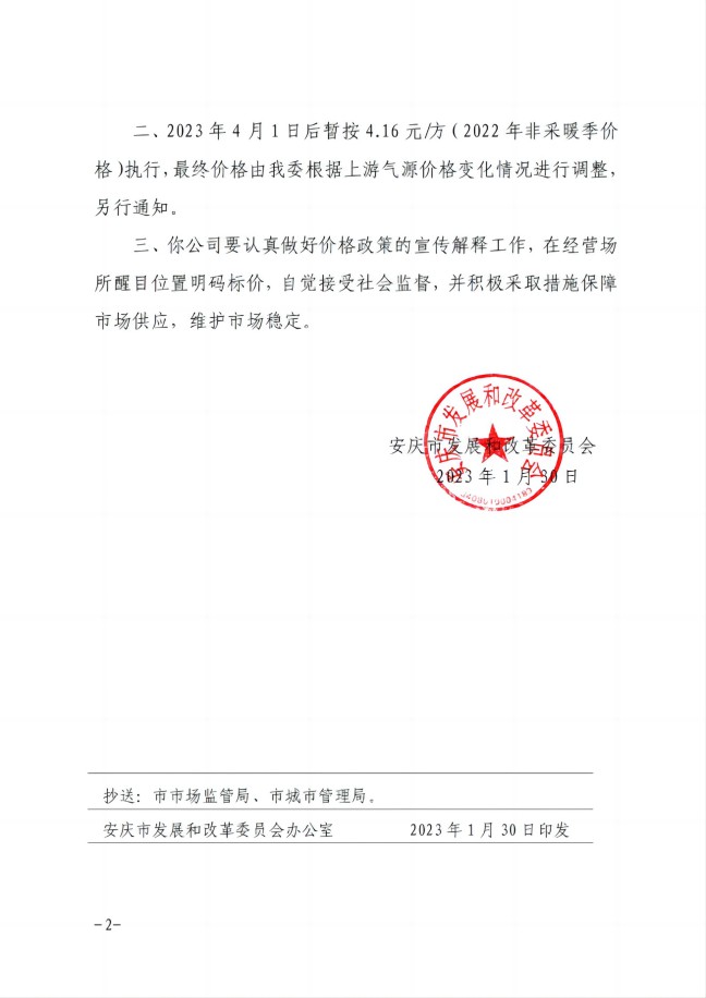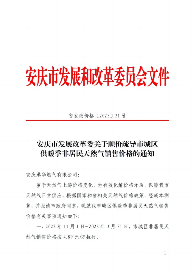 安慶市發(fā)展改革委關于順價疏導市城區(qū)供暖季非居民天然氣銷售(2023)價格的通知-安發(fā)改價格【2023】31號