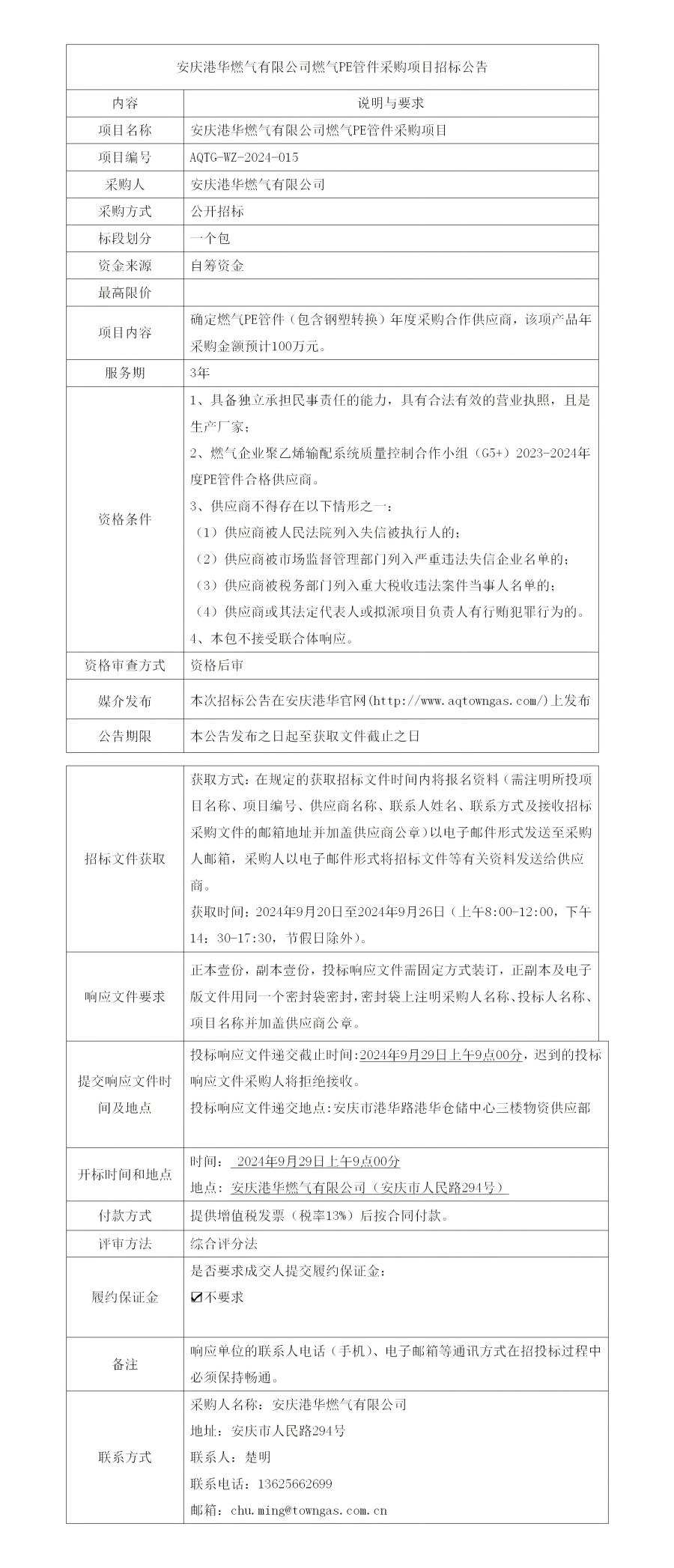 安慶港華燃?xì)庥邢薰救細(xì)釶E管件采購項目招標(biāo)公告