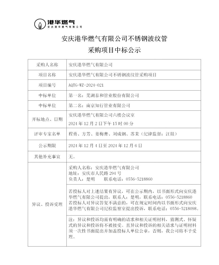 安慶港華燃?xì)庥邢薰静讳P鋼波紋管采購項(xiàng)目中標(biāo)公示