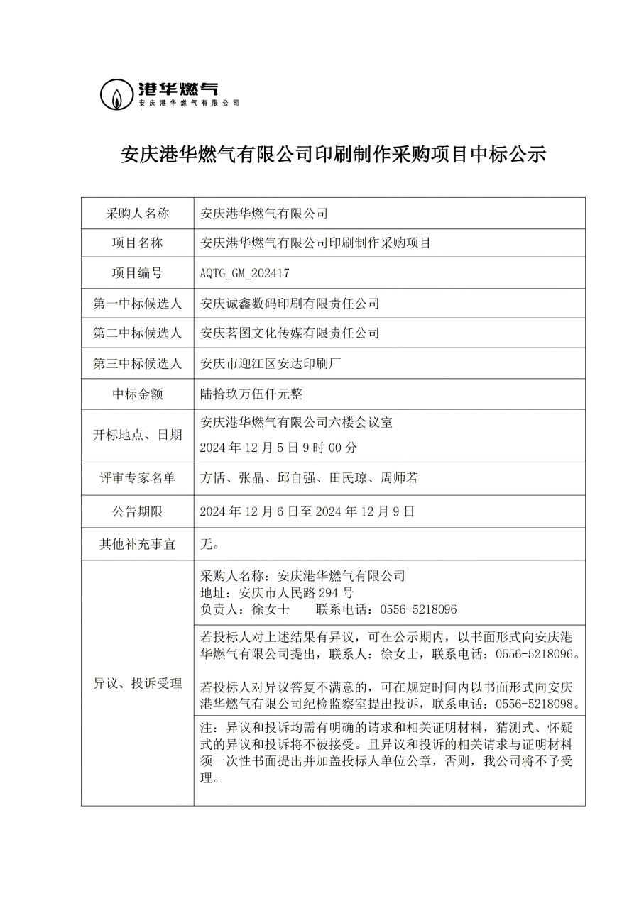 安慶港華燃氣有限公司印刷制作采購項目中標(biāo)公示
