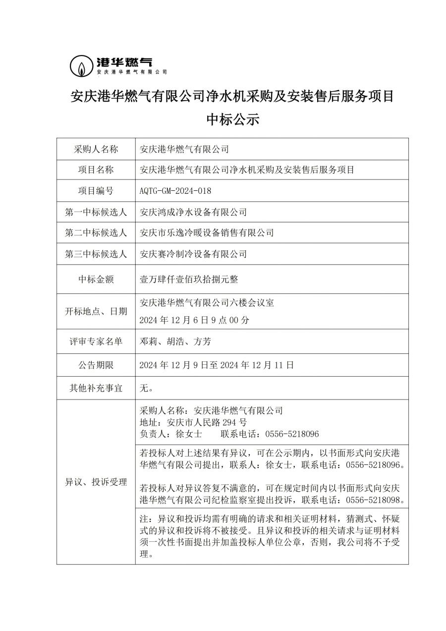 安慶港華燃氣有限公司凈水機采購及安裝售后服務項目中標公示