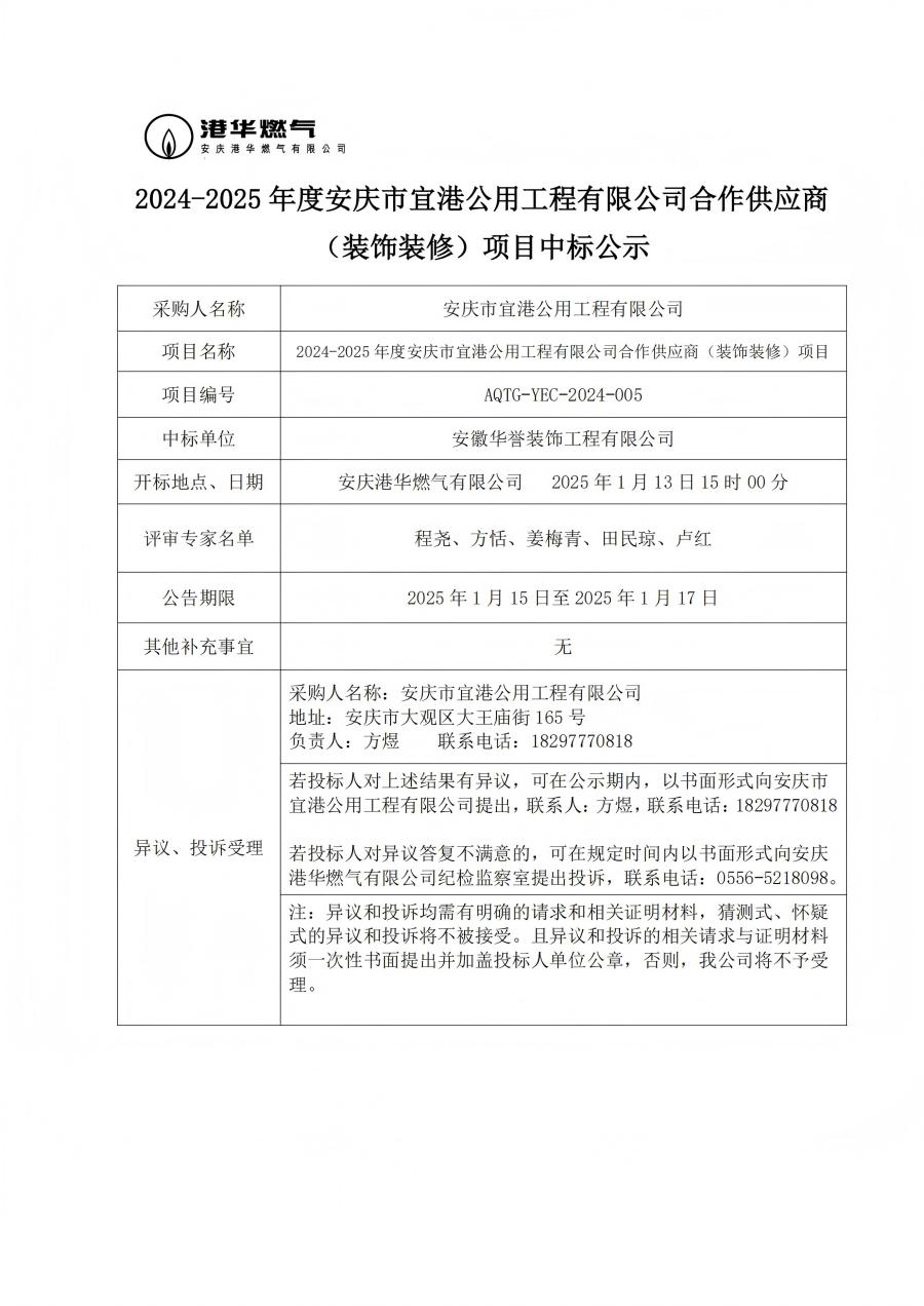 2024-2025 年度安慶市宜港公用工程有限公司合作供應(yīng)商 (裝飾裝修)項目中標(biāo)公示