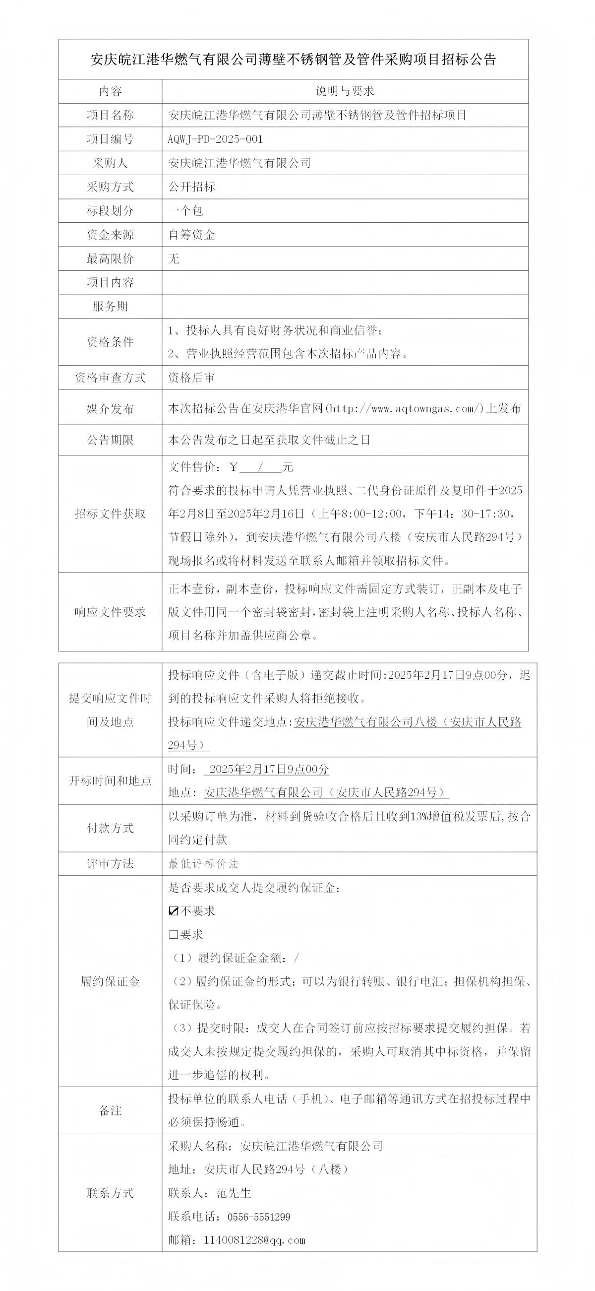 安慶皖江港華燃氣有限公司薄壁不銹鋼管及管件采購項目招標公告