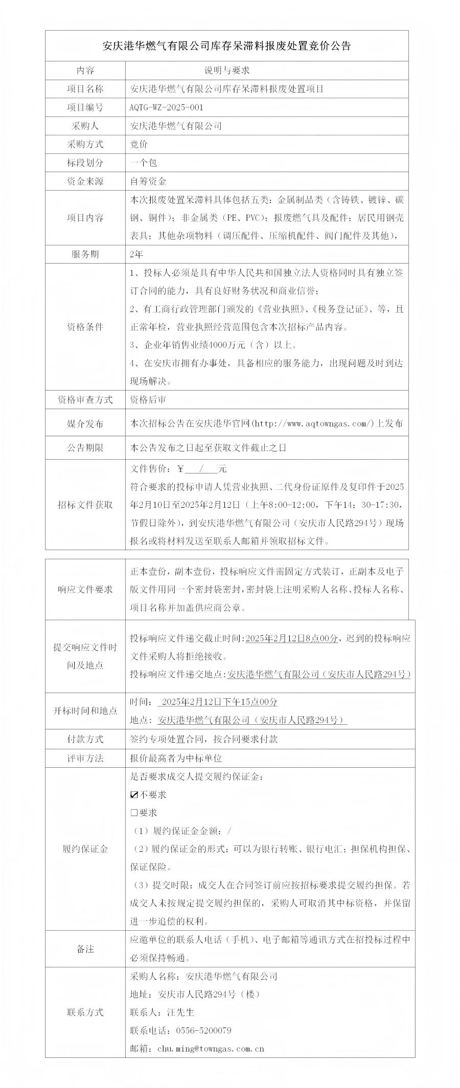 安慶港華燃?xì)庥邢薰編齑娲魷蠄?bào)廢處置競(jìng)價(jià)公告
