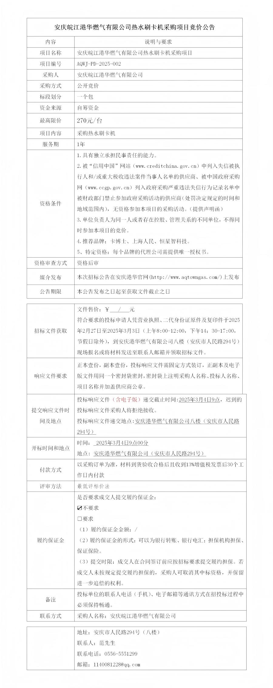 安慶皖江港華燃氣有限公司熱水刷卡機采購項目競價公告