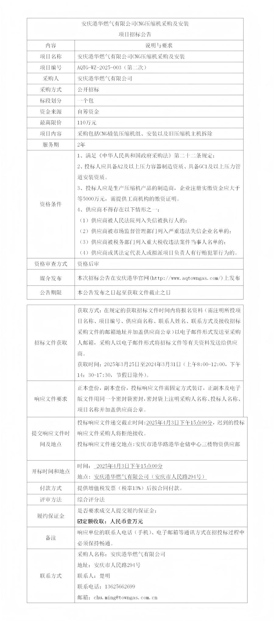 安慶港華燃氣有限公司CNG壓縮機采購及安裝項目招標(biāo)公告