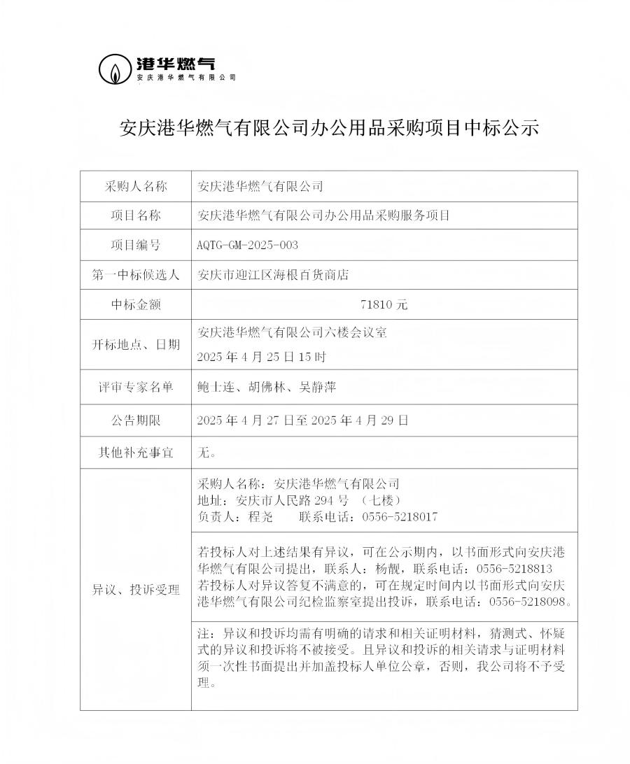 安慶港華燃氣有限公司辦公用品采購項目中標公示
