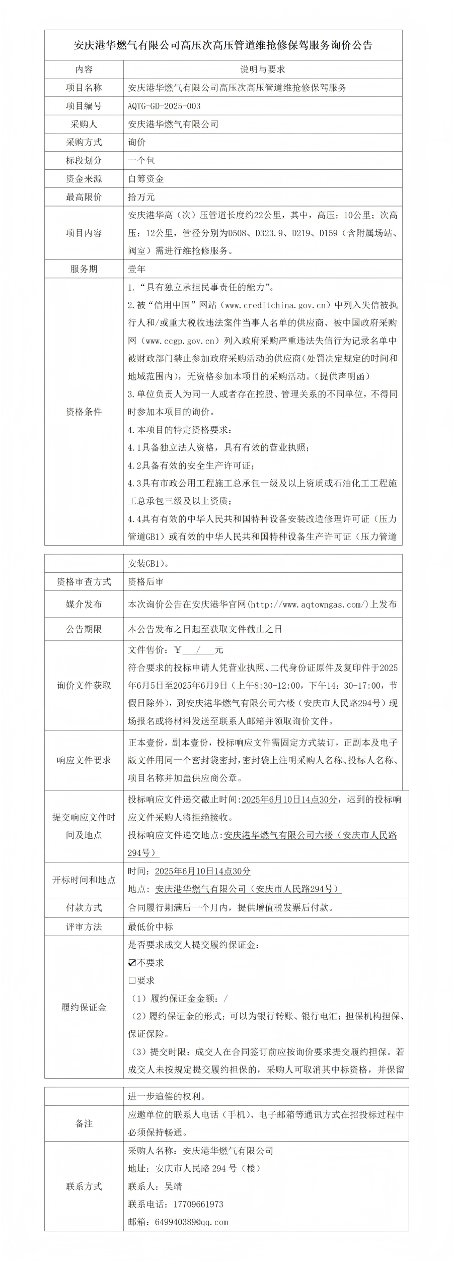 安慶港華燃?xì)庥邢薰靖邏捍胃邏汗艿谰S搶修保駕服務(wù)詢價(jià)公告