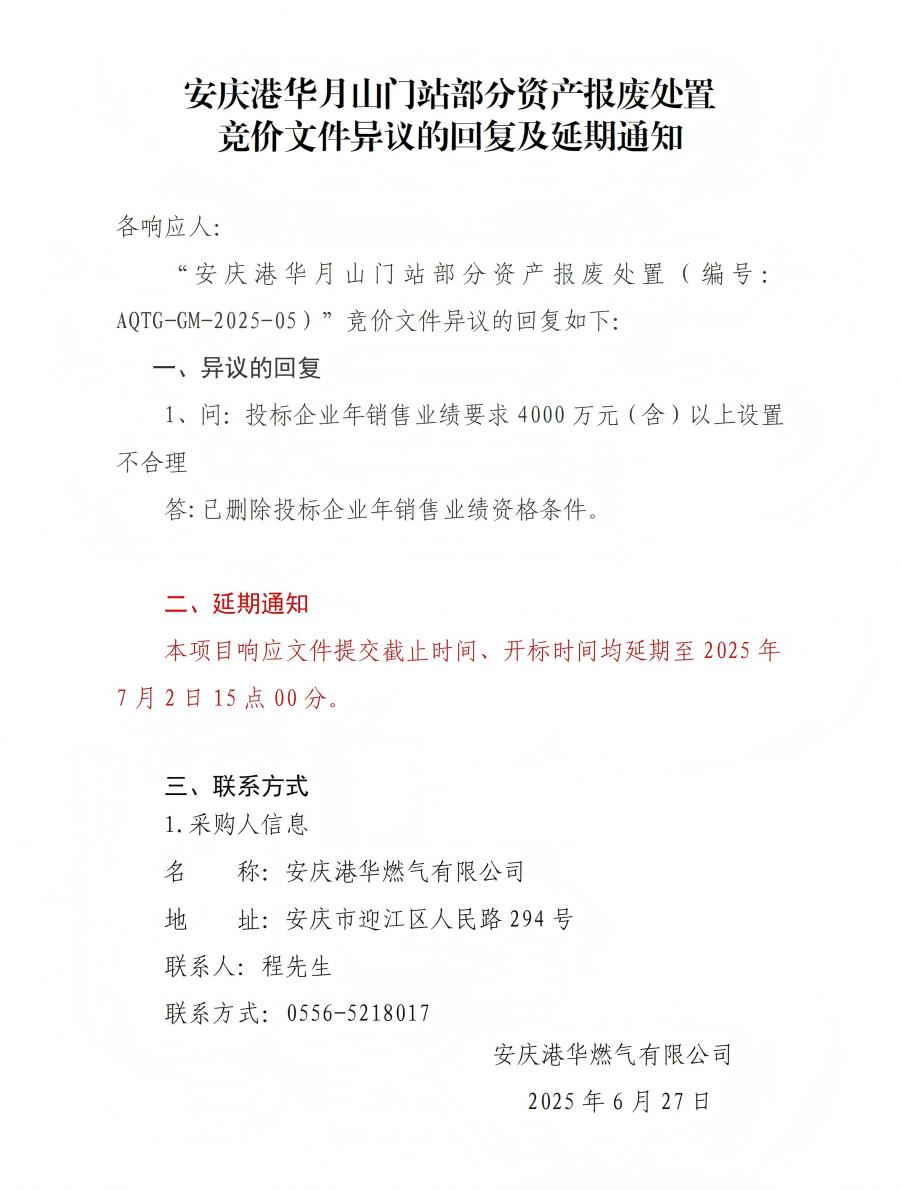 安慶港華月山門站部分資產報廢處置競價文件異議的回復及延期通知