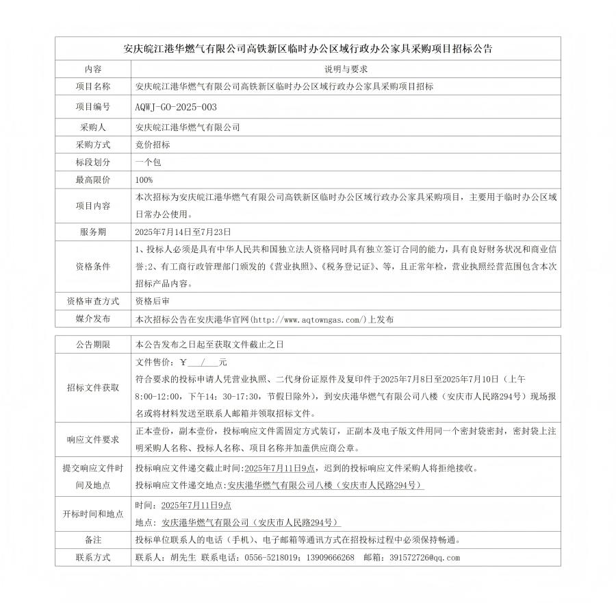 安慶皖江港華燃氣有限公司高鐵新區(qū)臨時辦公區(qū)域行政辦公家具采購項目招標(biāo)公告