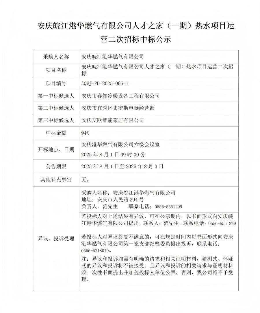 安慶皖江港華燃?xì)庥邢薰救瞬胖遥ㄒ黄冢崴?xiàng)目運(yùn)營二次招標(biāo)中標(biāo)公示