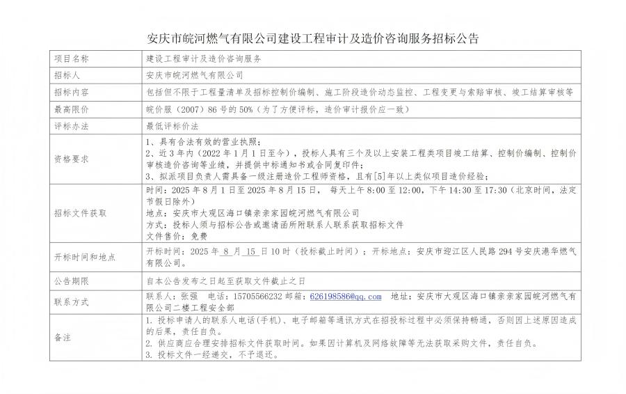 安慶市皖河燃?xì)庥邢薰窘ㄔO(shè)工程審計(jì)及造價(jià)咨詢(xún)服務(wù)招標(biāo)公告