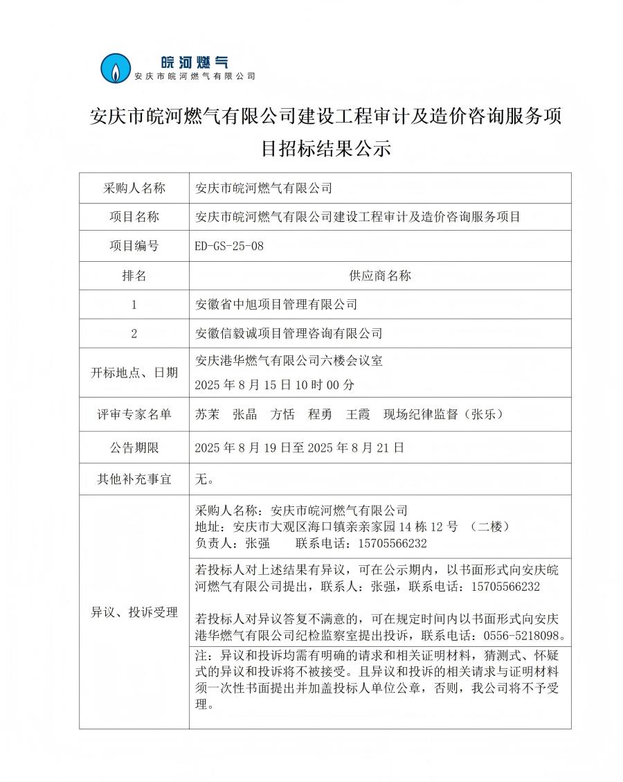 安慶市皖河燃?xì)庥邢薰窘ㄔO(shè)工程審計(jì)及造價(jià)咨詢服務(wù)項(xiàng)目招標(biāo)結(jié)果公示
