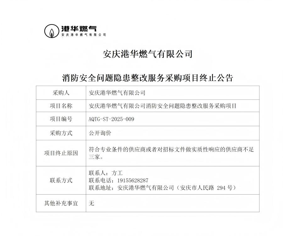 安慶港華燃?xì)庥邢薰鞠腊踩珕栴}隱患整改服務(wù)采購(gòu)項(xiàng)目終止公告