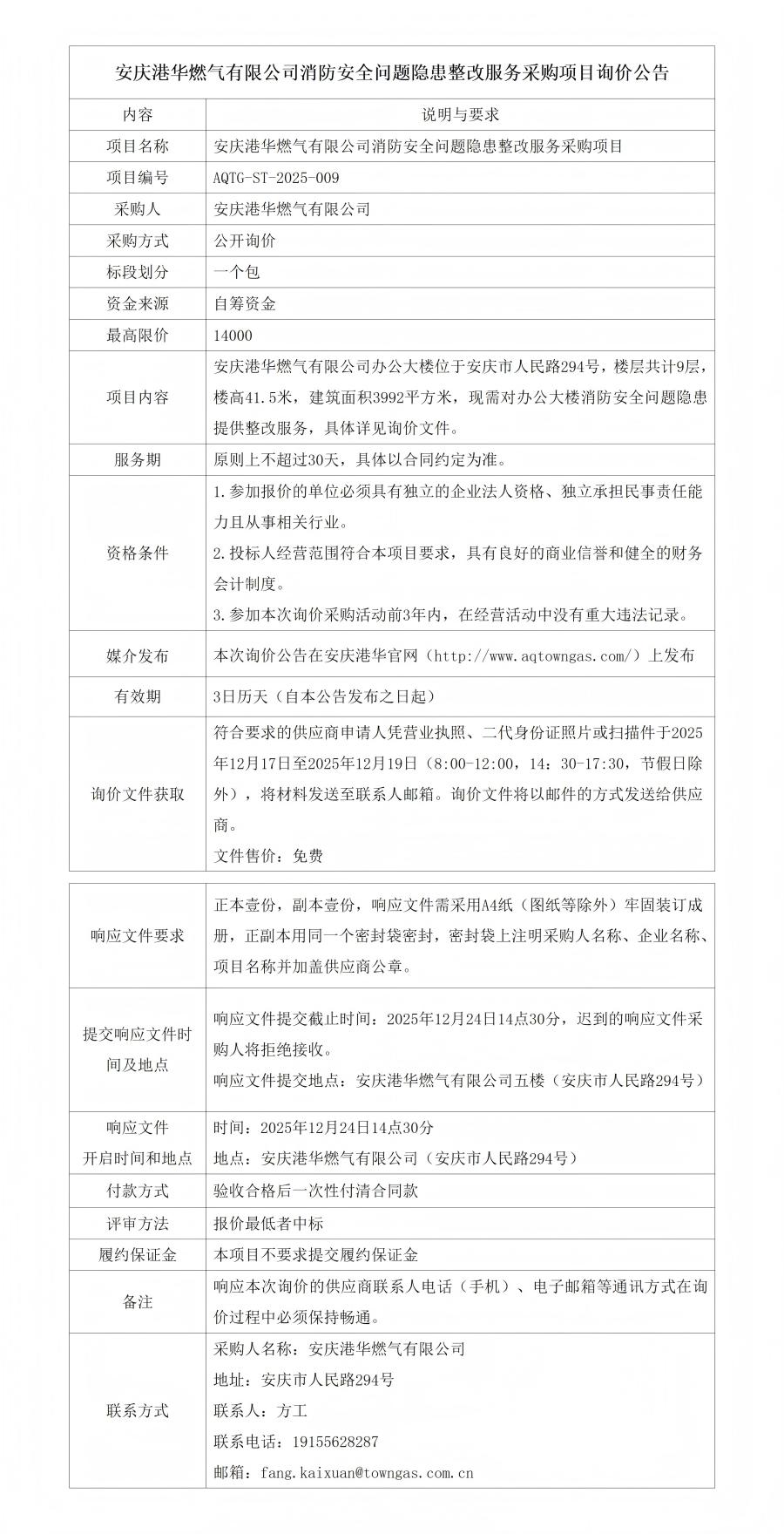 安慶港華燃氣有限公司消防安全問題隱患整改服務(wù)采購項目詢價公告