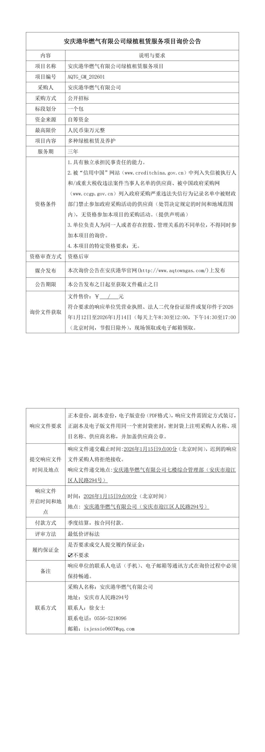 安慶港華燃氣有限公司綠植租賃服務(wù)項目詢價公告