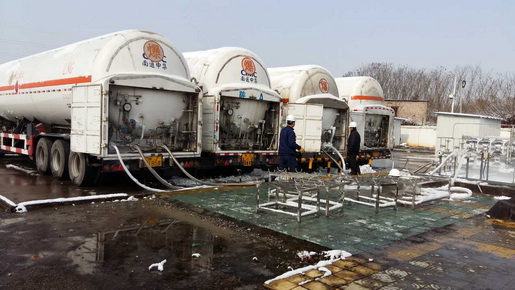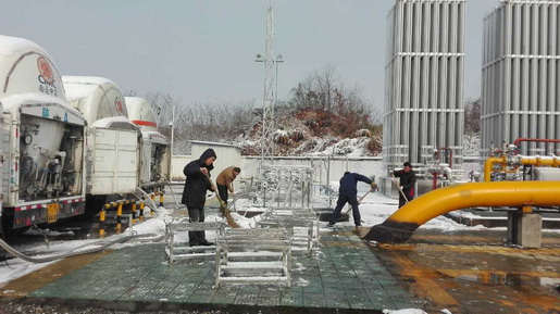 圖為1月23日,LNG釋放站工作人員在進行儲罐倒罐作業(yè)、清掃積雪