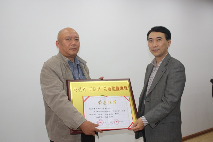 10月19日,市總工會副主席吳丹一行來到安慶港華,對公司維修搶險(xiǎn)中心榮獲2015年度全國“安康杯”競賽活動優(yōu)勝班組榮譽(yù)稱號及安慶港華被省總工會和省安監(jiān)局聯(lián)合授予 “安康杯”競賽優(yōu)勝單位表示祝賀并進(jìn)行授牌。